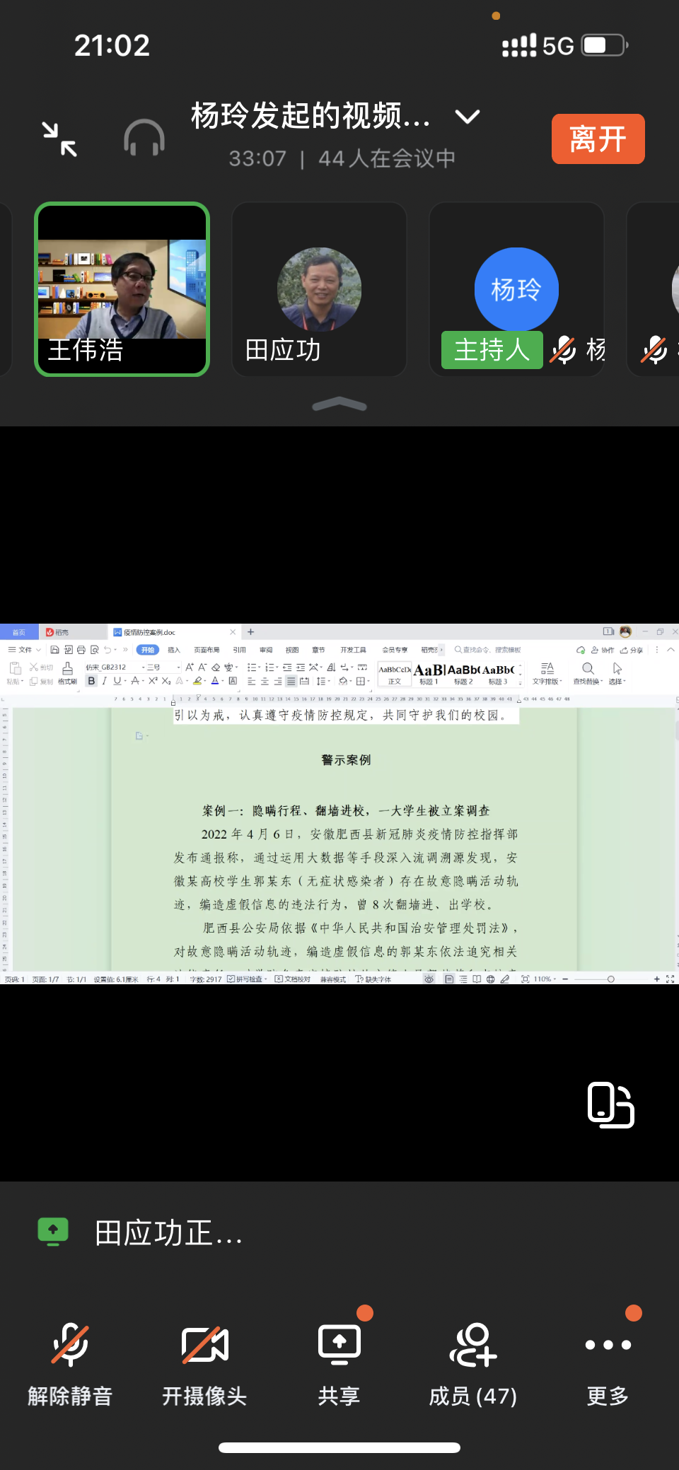 会上,王伟浩传达近期我校疫情防控专班会议精神,领学进一步加强校园疫情防控措施文件要求。副书记兼副院长田应功领学警示教育典型案例。综合办主任杨玲领学《关于紧急开展全省高校疫情防控严查的通知》、《致全省教育系统各级各组织和广大党员干部倡议书》。全体教职工学习《洛阳市贯彻落实国务院党委会全面加强安全生产“十五条硬措施”的实施方案》。