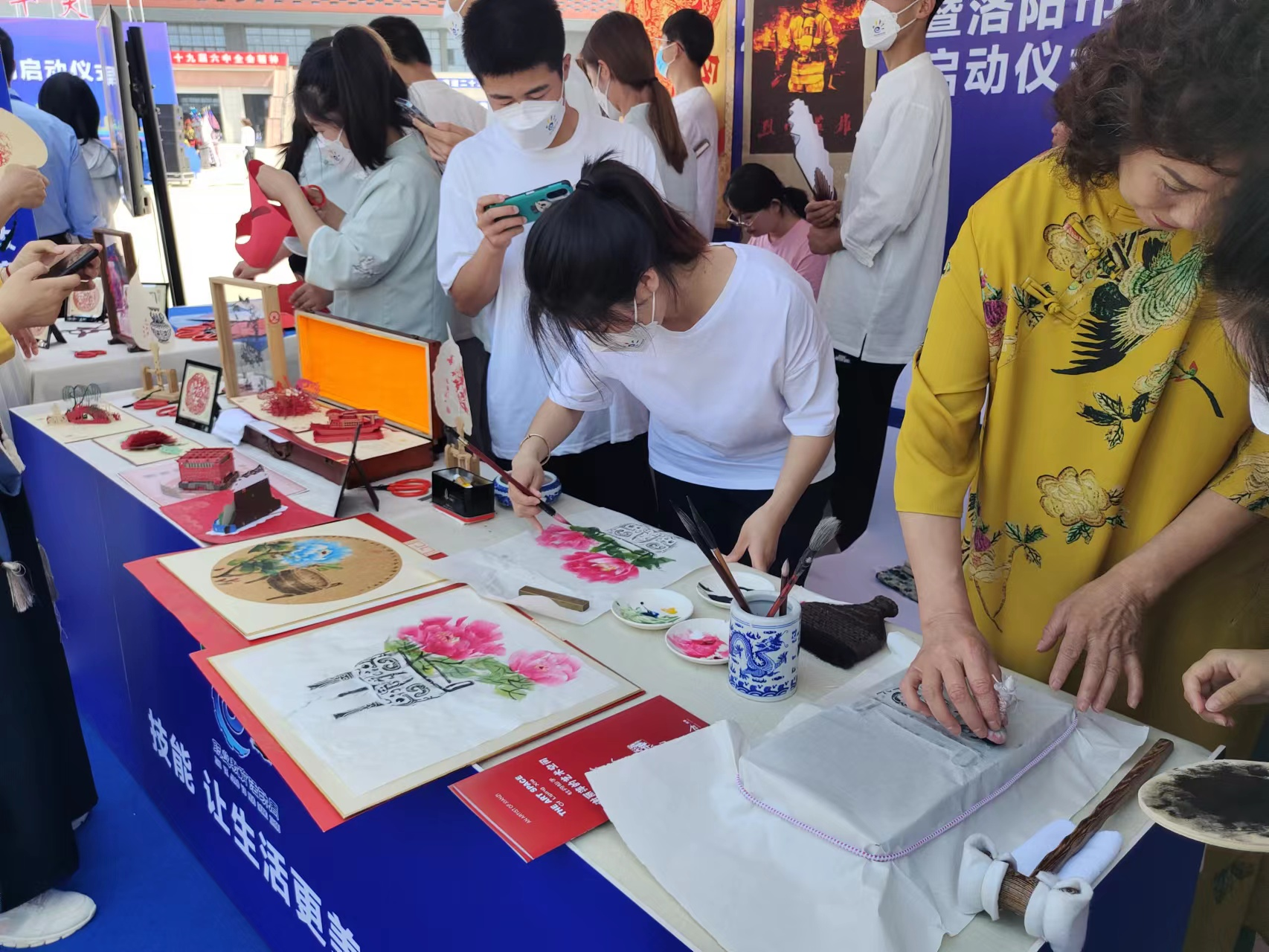 5月20日活动启动日当天,我院烹调工艺与营养专业展台被安排在“C”位,王飞老师的剪纸作品“黄河情”成为整个展区的“主轴线”。袁婧老师负责的调酒饮品展台和任幸老师负责的茶艺展台前人头攒动,师生纷纷前来品酒、品茶。应邀加入到我院展区的洛绣代表性传承人高彩霞老师带来了洛绣作品《牡丹长卷》,洛阳龙门画院的谢丽萍院长现场指导学生开展金石博古牡丹画的创作,都引得围观的师生啧啧赞叹。活动期间,副市长贺敏、校党委书记朱美荣、校长赵健一起来到展台前,饶有兴致地进行观赏。