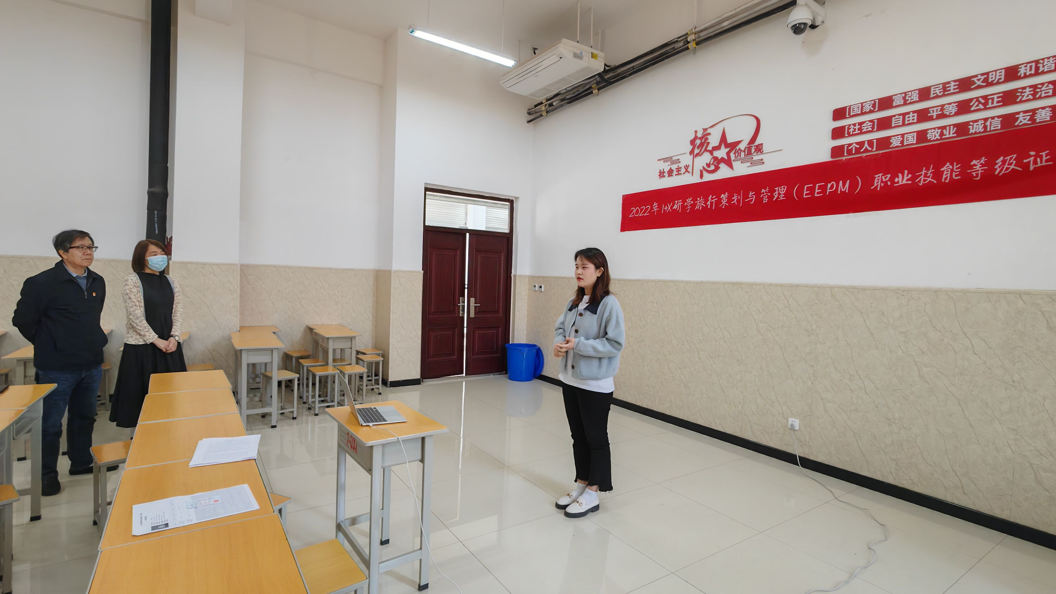 本次考试分为理论和实操两大部分。文化与旅游学院院长王伟浩、教务处副处长童志杰到现场巡视并指导了考核工作。