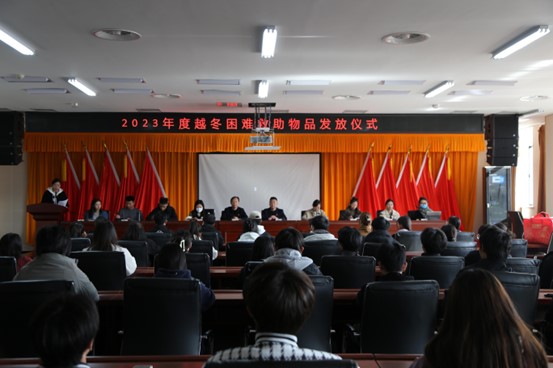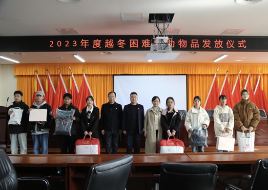 会上,王伊晓介绍了相关政策,宣读了越冬困难受助学生名单及具体物资,院领导李世恩、郭又荣、田应功共同为学生代表发放了救助物资。