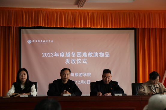 12月8日中午,洛职文旅院在6-509会议室举办2023年度越冬困难救助物品发放仪式,院党总支书记李世恩、院长郭又荣、党总支副书记田应功,学工办主任王伊晓、团总支书记吴昊以及各班专兼职辅导员一同出席,仪式由王伊晓主持。