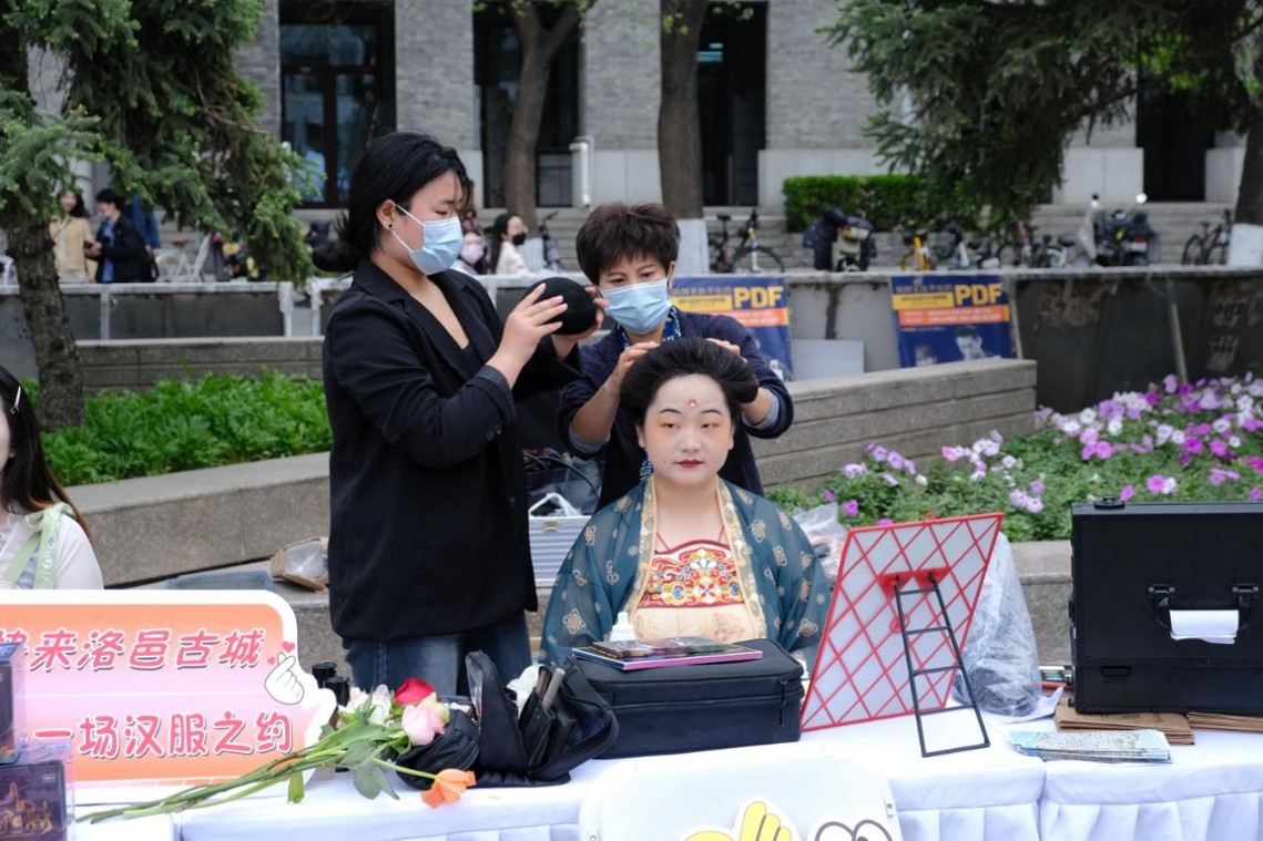 我院宁小丽老师以洛阳汉服为媒,以古风妆造会友,交流切磋。经宁小丽老师化妆出来的北大学子,妆容惊艳、服饰搭配各具特色,唐风贵妃妆造华贵雍容,甜美可爱明代少女妆造纤秀灵动,整体妆容淡雅素净,精致夺目,十分吸睛,吸引现场学子纷纷拍照留念。