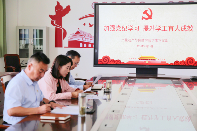 9月23日下午,文化遗产与传播学院学生党支部开展“加强党纪学习 提升学工育人成效”主题党日活动,党总支书记李世恩、党总支副书记田应功参加活动,活动由学生党支部书记王伊晓主持。