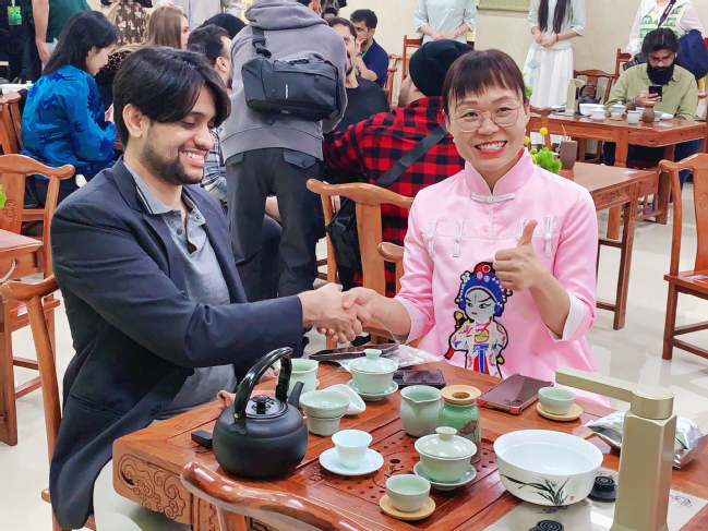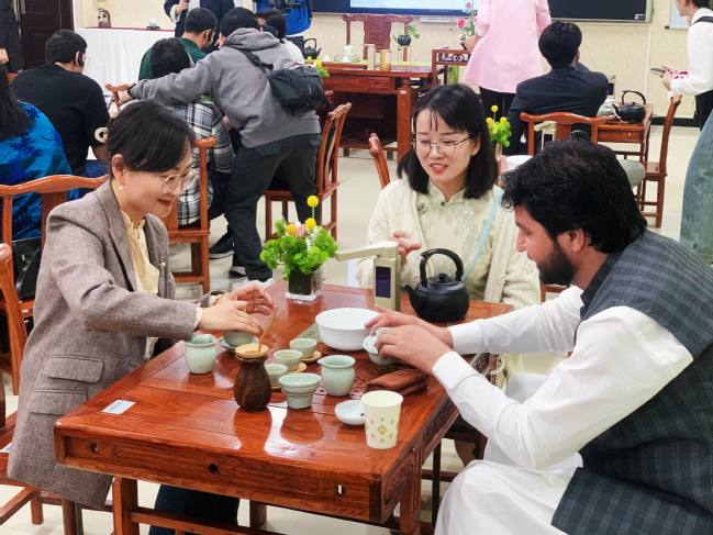 代表团一行人首先到茶艺实训室参观交流。落座后,我院酒店管理专业教研室教师王瑞娟对“茶艺”文化进行详细讲解,高铁教研室教师辛晶晶以“泡一杯中国茶”为题,为巴基斯坦朋友们现场演示茶艺,一举一动尽显优雅,充分展示茶艺的独特韵味。演示结束后,茶艺社的两名学生为在场众人斟茶,进行品鉴。在品鉴过程中,对茶艺文化以及每件茶具的独特作用进行讲解。