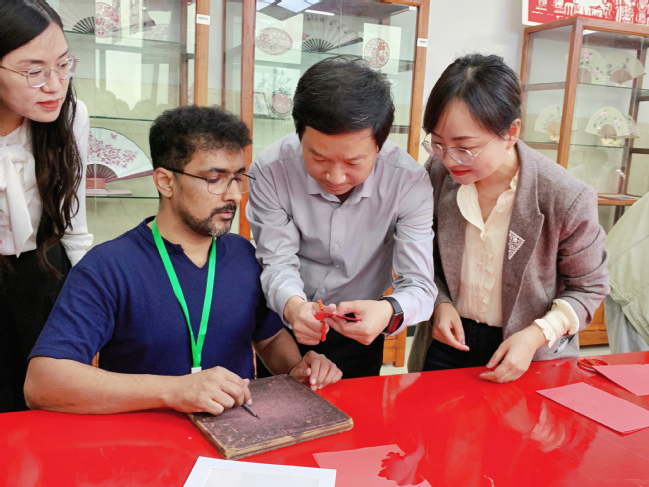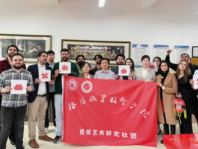 随后,代表团前往王飞大师工作室,中原大工匠王飞从剪纸的悠久历史、丰富的艺术表现形式以及精湛的制作技艺,对剪纸艺术进行介绍,并展示了部分剪纸作品。在剪纸技艺实训室,巴基斯坦朋友们亲手体验剪纸。郭又荣、王飞与巴基斯坦代表团一起展示了自己的剪纸作品并合影。
