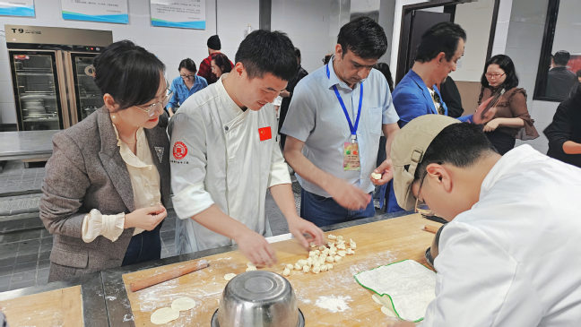 活动最后,代表团来到烹饪实训基地。由中式面点实训教师王萌蕾为代表团介绍饺子的起源及历史,同时,烹饪专业学生在一旁演示饺子的做法。巴基斯坦朋友们亲自动手,感受中国传统美食“饺子”的魅力,促进了中巴美食文化的交流。
