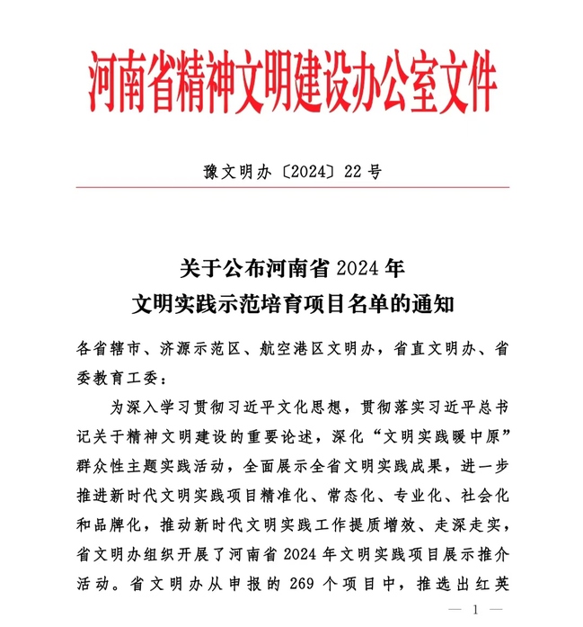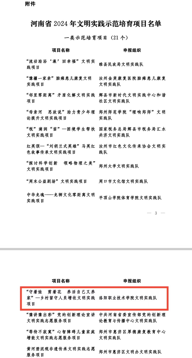 在2024年9月底省文明办组织的河南省2024年文明实践项目展示推介活动中,我院王飞、田应功、王伊晓、吴昊、杜昊峰、王丹、张安琪团队的“守着娃、剪着花、养活自己又养家”——乡村留守人员增收文明实践项目,从全省269个项目中脱颖而出,被评为21个一类示范培育项目之一,取得我校文明实践项目成绩新的突破!