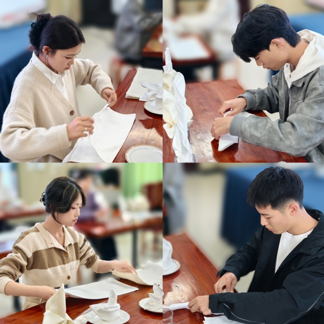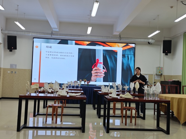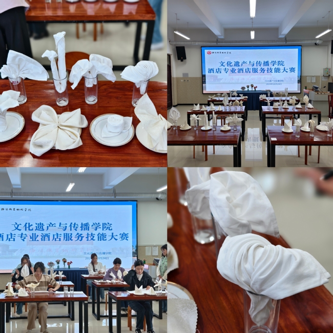 大赛内容包括两个模块:餐巾折花和中餐主题宴会策划设计。在餐巾折花模块,同学们手法娴熟,创意无限,将简单的餐巾变成了一件件惟妙惟肖的精美艺术品。在中餐主题宴会策划设计模块,同学们通过宴会设计、PPT展示,从宴会的主题设定到流程安排,再到菜品搭配,彰显精益求精,同学们的讲解清晰流畅,充分展示了他们的策划能力和对宴会文化的理解。