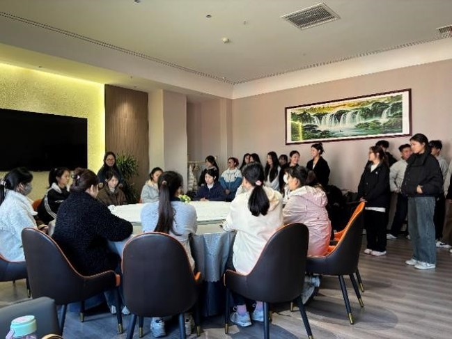 在烹饪产教融合生产性实训基地,学生们不仅参观了雅致的包间及繁忙的厨房,更深入了解了餐厅的日常运营和服务标准。魏老师给同学们详细讲解了中餐摆台的相关知识,以及强调了服务过程中的服务意识和需要注意到的问题。同时让学生亲自上阵,体验餐厅服务的各个环节,引导学生们将课堂所学融入实际操作中。随后,同学们参观了基地的面点实训室、雕刻实训室,以及中餐热菜制作流程,让学生清楚了解中餐厅的厨房运作和酒店餐饮部产品的生产加工工艺。