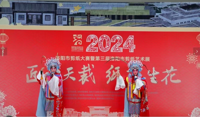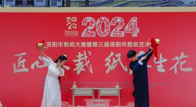 开幕式上,洛阳职业技术学院学生进行了豫剧穆桂英挂帅、茶艺长嘴壶、剪纸服饰秀等非遗表演。
