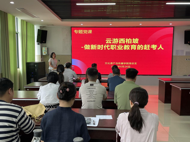 6月26日下午,文化遗产与传播学院党总支组织全体党员在309智慧旅游实训室开展主题党日活动,党总支书记李世恩、教工党支部书记杜文霞为党员上党课,课后集体制作红色文创作品,共同喜迎中国共产党成立104周年的到来。院长郭又荣参加本次党日活动。