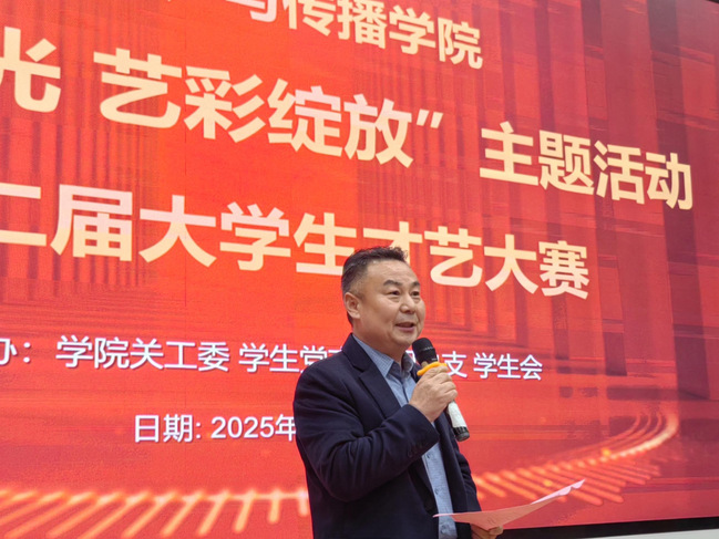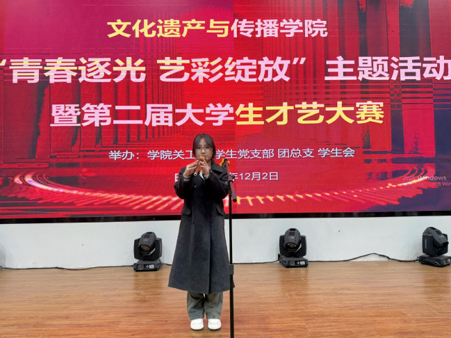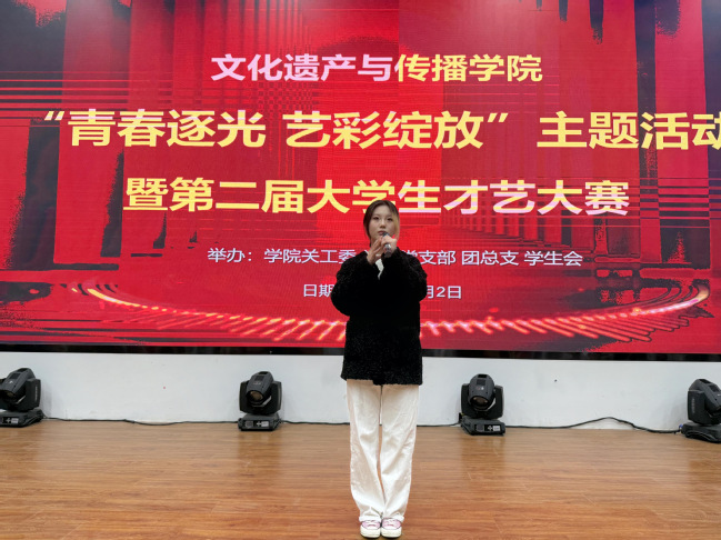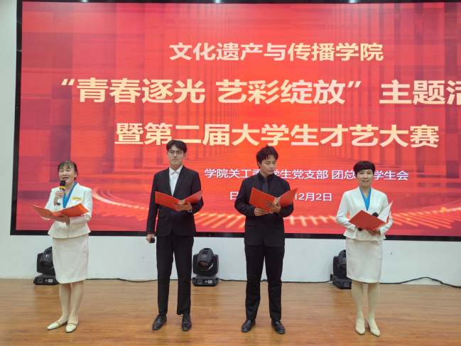 2025年12月2日下午,文化遗产与传播学院关工委联合学院学生党支部、团总支、学生会在大学生活动中心心理剧场开展了“青春逐光,艺彩绽放”主题活动暨学院第二届学生才艺大赛。学院关工委主任李世恩、副主任田应功、薛振霞及关工委成员,洛阳之声朗诵艺术团代表,学生党支部全体党员及各专业学生代表百余人参加活动。