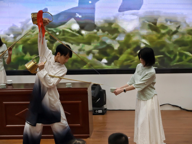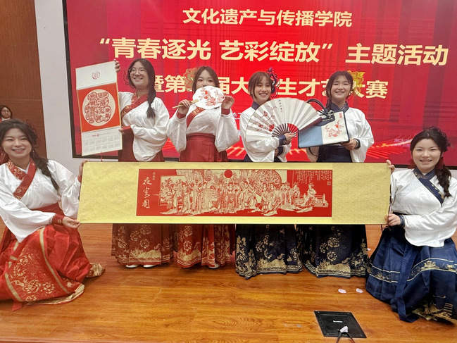 袁烁、李冰妍、张振楠等学生献上歌曲、葫芦丝演奏、川剧变脸等精彩节目,茶艺社、子衿汉服社、剪纸艺术研究社分别进行了长嘴壶表演、汉服展示表演和文化创意走秀展,这些节目生动诠释中华优秀传统文化的韵味与风采,展现了文传学院五育并举、多措育人的良好成效和学子们勤奋好学、热爱生活、热爱祖国的良好精神风貌。