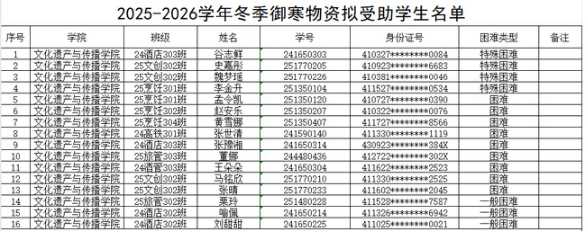 为体现我校对家庭经济困难学生的关怀,解决家庭经济困难学生御寒衣物等紧缺现状,让学生温暖过冬,根据我校学生资助工作的有关文件精神,决定对我院家庭经济困难及有突发家庭经济困难学生发放越冬救助物品,结合我院实际情况,本着公平、公正、公开的原则,我院2025-2026学年冬季困难学生御寒物资发放评定工作已结束。