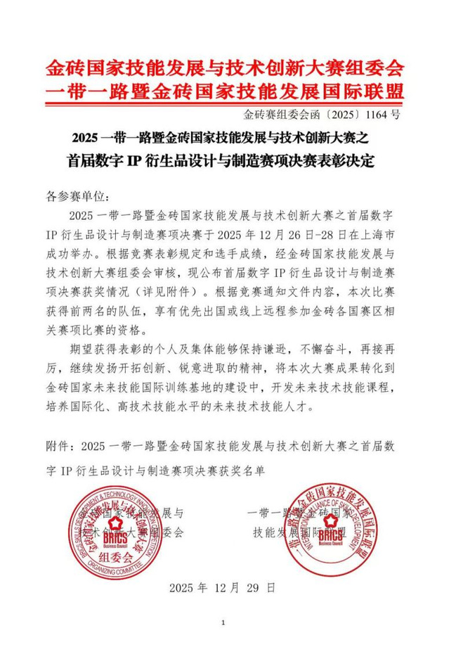 近日,2025年“一带一路”暨金砖国家技能发展与技术创新大赛首届数字IP衍生品设计与制造赛项全国总决赛圆满落幕。洛阳职业技术学院文化遗产与传播学院参赛团队凭借扎实的专业功底、创新的设计理念与出色的实战能力,在全国强队的激烈角逐中脱颖而出,斩获一等奖1项、三等奖1项,指导教师获评优秀指导教师,学校荣获最佳组织奖,用亮眼战绩彰显了该校在数字文创技能人才培养领域的过硬实力。