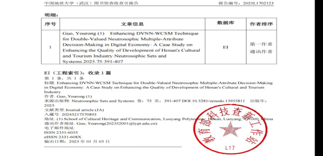 9.郭又荣:Enhancing DVNN-WCSM Technique for Double-Valued Neutrosophic Multiple-Attribute Decision-Making in Digital Economy: A Case Study on Enhancing the Quality of Development of Henan's Cultural and Tourism Industry