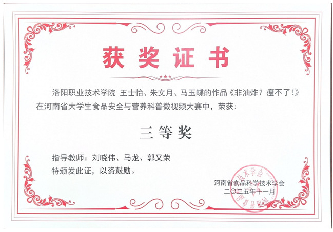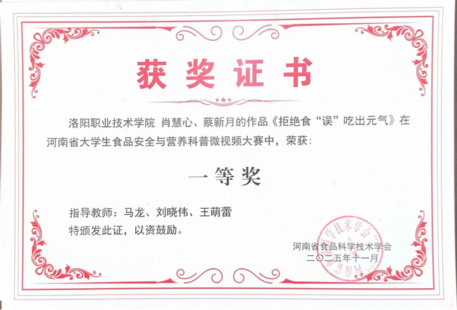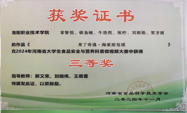 2. 2025年马龙、刘晓伟、郭又荣指导学生获河南省大学生食品安全与营养科普微视频大赛一等奖、三等奖各1项