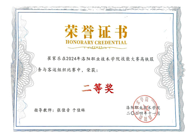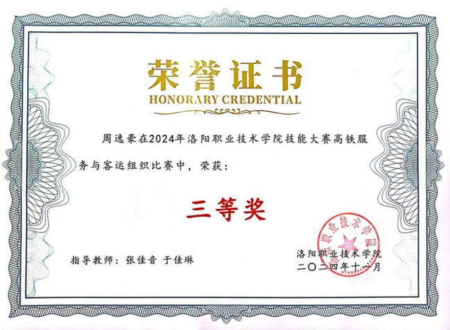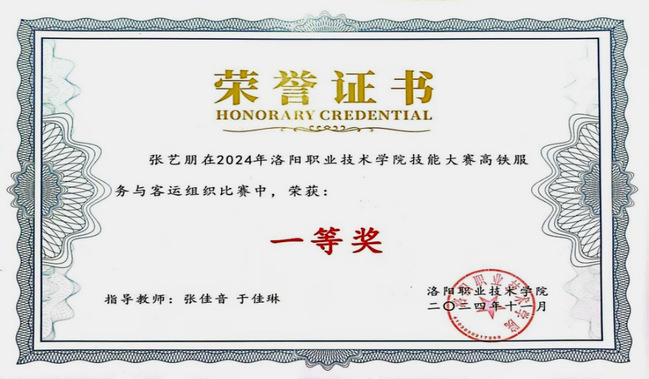7. 2024年张佳音指导学生获洛阳职业技术学院技能大赛高铁服务与客运组织比赛一等奖、二等奖、三等奖各1项