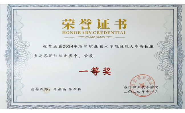 8.2024年辛晶晶、李希冉指导学生获洛阳职业技术学院技能大赛高铁服务与客运组织比赛一等奖 |