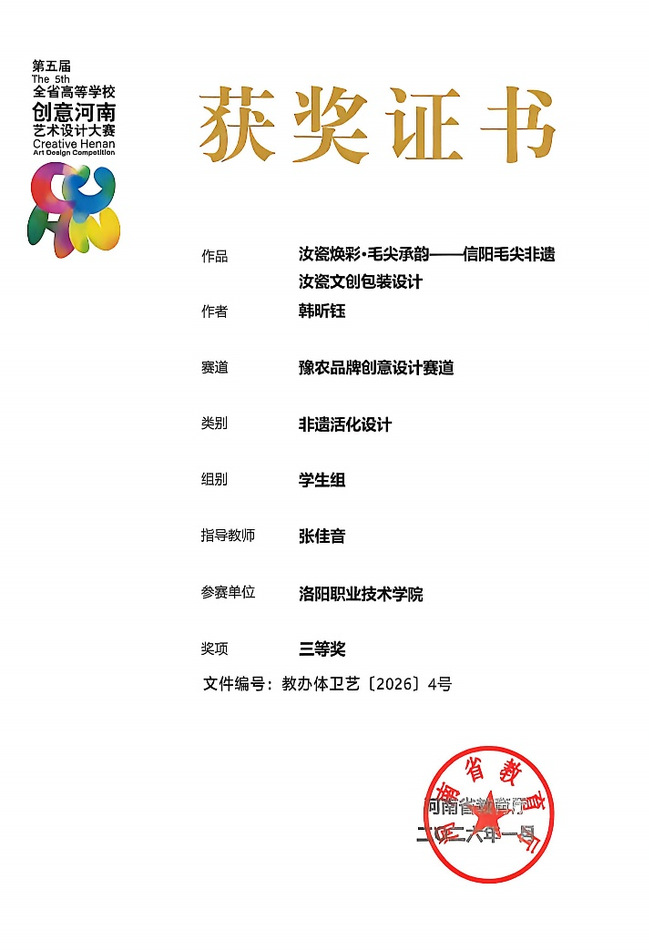 1. 2026年张佳音指导学生获得河南省高等学校第五届“创意河南”艺术设计大赛三等奖
