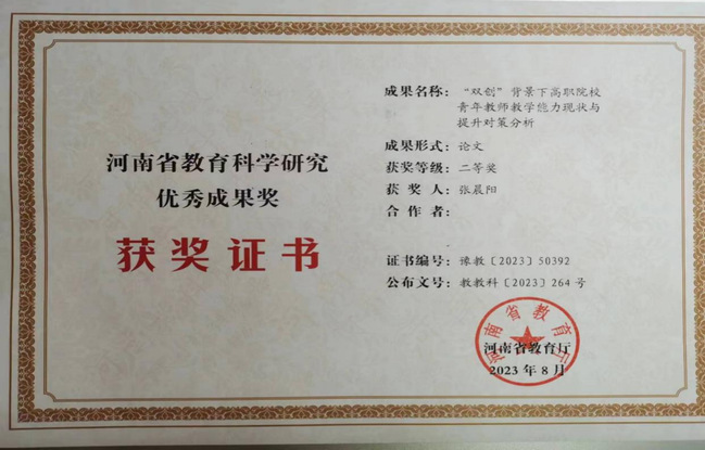 1. 2023年张晨阳获河南省教育科学研究优秀成果奖二等奖
