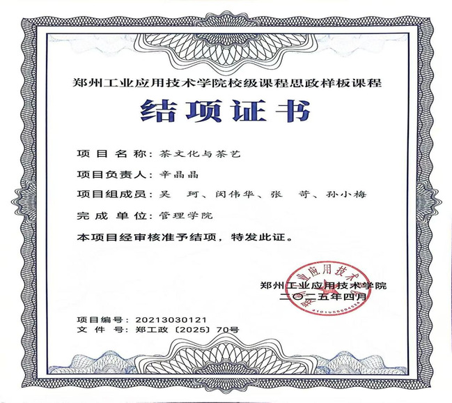 3. 2025年辛晶晶《茶文化与茶艺》获批郑州工业应用技术学院校级课程思政样板课程