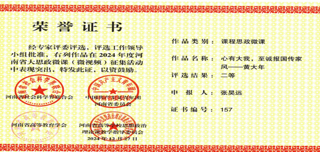 2. 2024年张昊远《心有大我,至诚报国传家风——黄大年》获批河南省大思政课程微课