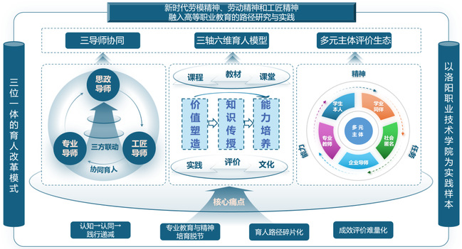 本成果始于2023年洛阳职业技术学院校级教育教学改革重点项目《新时代劳模精神、劳动精神和工匠精神融入高等职业教育的路径研究与实践》建设,2024年获批河南省高等教育教学改革研究与实践项目(项目编号:2024SJGLX0927),聚焦新时代劳模精神、劳动精神、工匠精神(以下简称“三种精神”)融入高等职业教育的核心命题,以洛阳职业技术学院为核心实践样本,针对高职育人实践中的共性痛点开展系统性研究与实践。历经3年的探索优化,成果构建了“三导师协同+三轴六维育人模型+多元主体评价生态”三位一体的育人改革体系,形成了可复制、可推广的高职“三种精神”系统化育人范式,为高职教育落实立德树人根本任务、培养德技并修的高素质技术技能人才提供了实践路径与理论支撑。