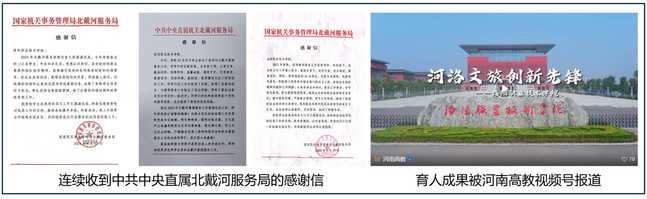 本成果将育人实践与社会服务深度结合,取得了强烈的社会反响。成果支撑学校建成国家级河洛文化生态保护试验区非物质文化重点实验室,推动非遗传承与高职人才培养深度融合,指导学校剪纸艺术研究社等百强社团开展非遗传承实践活动,助力河洛文化的活态传承;相关育人实践被河南省教育厅官方微信公众号、河南高教杂志社官方平台宣传报道,获得了行业与社会的广泛认可;团队指导学生参加河南省职业技能大赛,斩获二等奖2项及其他各类省级比赛获奖10项,学生培养质量得到行业企业的高度认可,连续收到中共中央直属北戴河服务局的感谢信,毕业生岗位适配度与职业发展潜力显著提升;项目形成的育人经验,为地方文旅产业、餐饮行业培养了大批兼具职业技能与职业精神的高素质人才,有力服务了地方经济社会高质量发展。