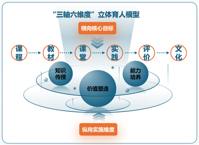 1.构建系统化育人框架:建立“三轴六维”立体育人模型,以“价值塑造、知识传授、能力培养”三大育人目标为横向三轴,以“课程、教材、课堂、实践、评价、文化”为纵向六维,形成全环节、全流程的立体育人网,打破“单点融入、生硬植入”的传统模式。